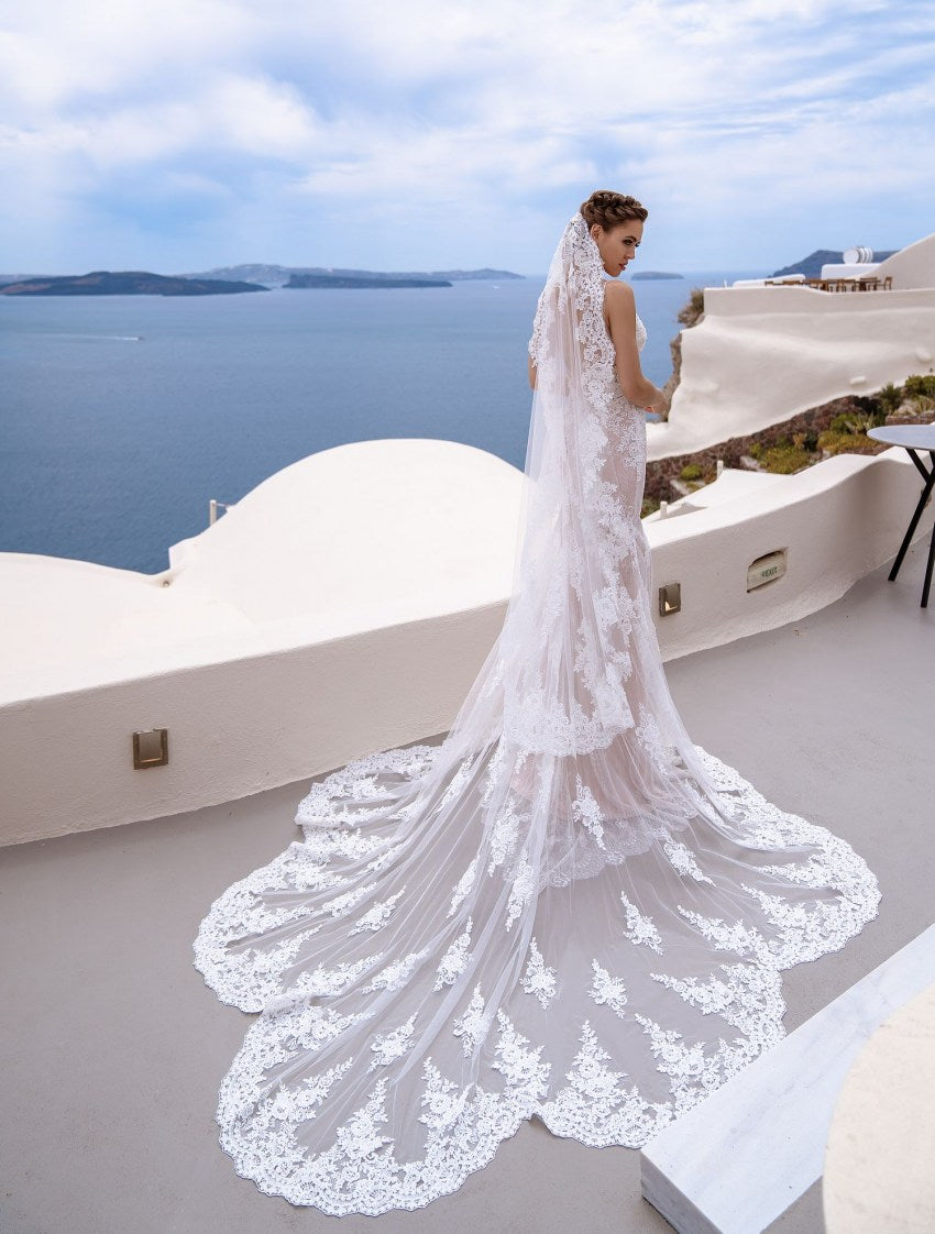 Exquisite mermaid wedding dress on thin straps from Chantilly lace. The corset of the dress is additionally decorated with lace, which is embroidered with beads. The back of the dress has a V-neck. A special feature of the dress is a figured train, which adds elegance to the image of the bride.