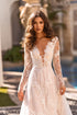 Gorgeous a-line dress with long sleeves and off-the-shoulder illusion. The back is closed with buttons. Air flowing skirt with a train gives the dress tenderness.