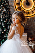 Incredibly delicate dress, the top of which is made of floral lace embroidered with sequins with a puffy skirt made of multi-layered tulle. The back of the dress has a deep V-neckline and is complemented by an airy tulle bow.