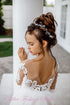 Incredibly delicate dress, the top of which is made of lace embroidered with sequins with a puffy skirt made of multi-layered tulle. The back of the dress has a V-neckline and is complemented by an airy tulle bow. Glitter skirt can be in ivory or nude color.