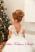 Very beautiful flower girl dress with a fluffy layered tulle skirt. The top of the dress is made of floral lace embroidered with sequins. At the back, the dress has V-neckline and is complemented by an airy tulle bow.