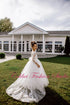 Incredibly delicate dress with the long lace train, the top of which is made of lace embroidered with sequins with a puffy skirt made of multi-layered tulle. The dress is complemented by an airy tulle bow. The back of the top of the dress is fastened with buttons.