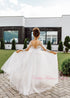Incredibly delicate dress, the top of which is made of lace embroidered with sequins with a puffy skirt made of multi-layered tulle. The back of the dress has a V-neckline and is complemented by an airy tulle bow. Glitter skirt can be in ivory or nude color.